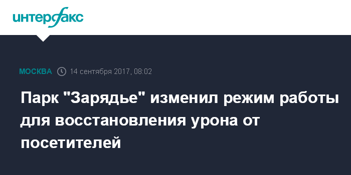 "Ввод ограничений - вынужденная мера. Ландшафт парка - его основа, без которой "Зарядье" не сможет существовать. И если мы сейчас не позаботимся о зеленых растениях, многие из которых пострадали в результате неаккуратных действий посетителей, то они погибнут", - рассказал Трехлеб порталу московской мэрии в понедельник. По его словам, часть насаждений придется восстанавливать, работы начнутся 18 сентября.