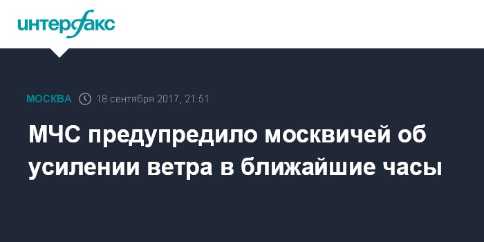Москва. 18 сентября. INTERFAX.RU - В ближайшие часы в столице ожидается усиление ветра до 18 метров в секунду, сообщили "Интерфаксу" в пресс-службе ГУ МЧС России по Москве.