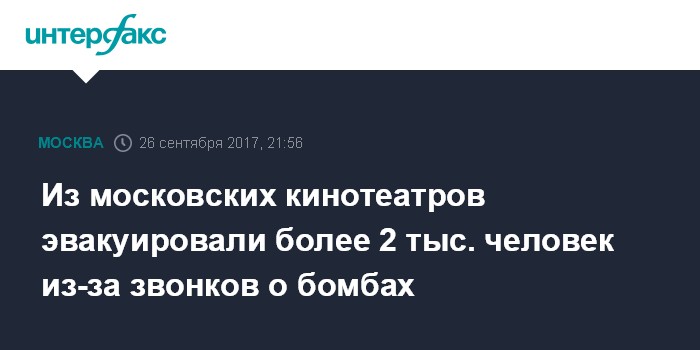 Москва. 26 сентября. INTERFAX.RU - Более двух тысяч человек эвакуированы из семи кинотеатров в Москве после анонимных звонков о минировании, сообщил "Интерфаксу" во вторник информированный источник.