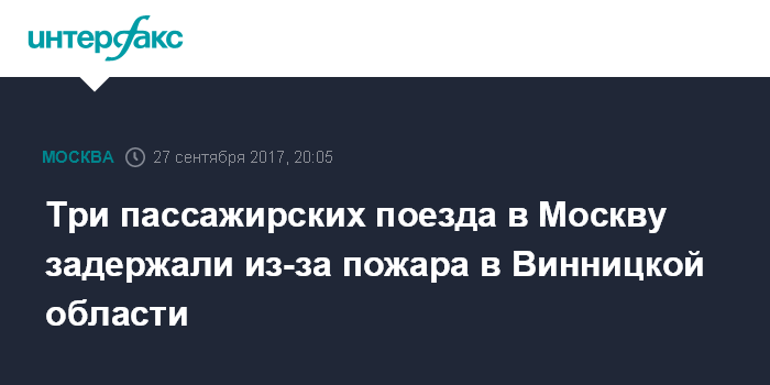 Москва. 27 сентября. INTERFAX.RU - Три пассажирских поезда в настоящее время задерживаются из-за пожара в Винницкой области Украины.