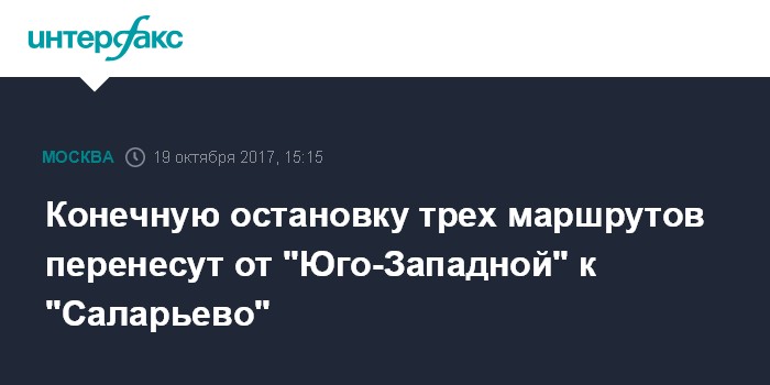 Москва. 19 октября. INTERFAX.RU - ГУП МО "Мострансавто" перенесет конечные остановку автобусов, следующих по трем маршрутам из Наро-Фоминска, Тарасково и Краснознаменска в Москву от станции метро "Юго-Западная" к "Саларьево", сообщает пресс-служба предприятия.
