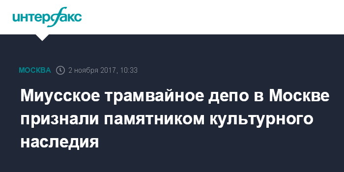 Москва. 2 ноября. INTERFAX.RU - Миусское трамвайное депо, расположенное на Лесной улице в центре столицы, получило статус памятника культурного наследия регионального значения, сообщает сайт мэрии Москвы в четверг. До недавнего времени депо имело статус выявленного объекта культурного наследия.