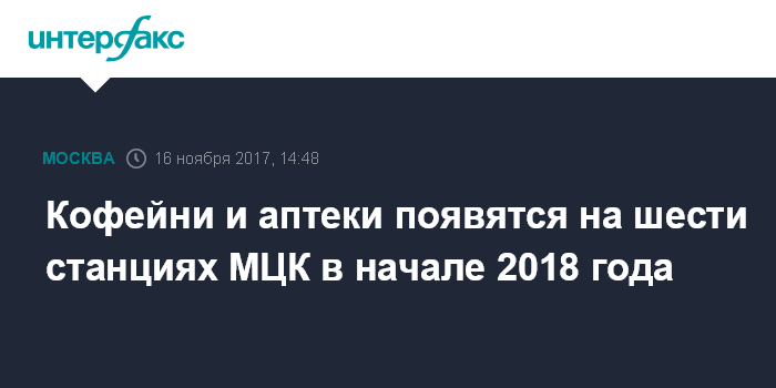 Москва. 16 ноября. INTERFAX.RU - Кофейни и аптечные пункты начнут работать на шести станциях Московского центрального кольца (МЦК) в начале 2018 года, сообщает в четверг на сайте мэра Москвы.