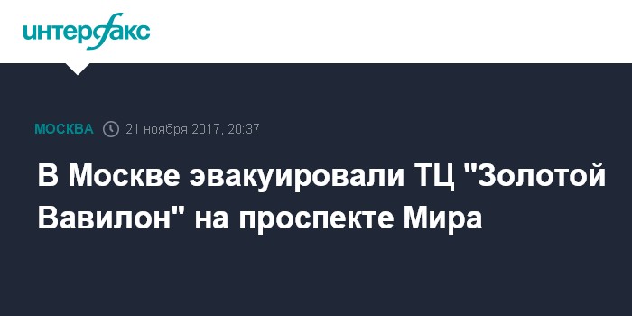 Москва. 21 ноября. INTERFAX.RU - В правоохранительные органы поступил звонок об угрозе взрыва в торговом центре "Золотой Вавилон" на Проспекте мира, проводится эвакуация, сообщил "Интерфаксу" осведомленный источник.