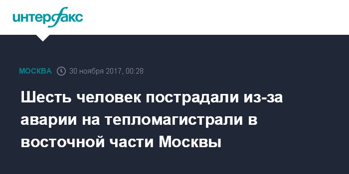 Москва. 30 ноября. INTERFAX.RU - Вечером в среду на московской тепломагистрали в восточной части Москвы произошел разрыв, из-за которого пострадали шесть человек, сообщил руководитель департамента ЖКХ Москвы Гасан Гасангаджиев "Интерфаксу". Трое из пострадавших отказались от госпитализации.