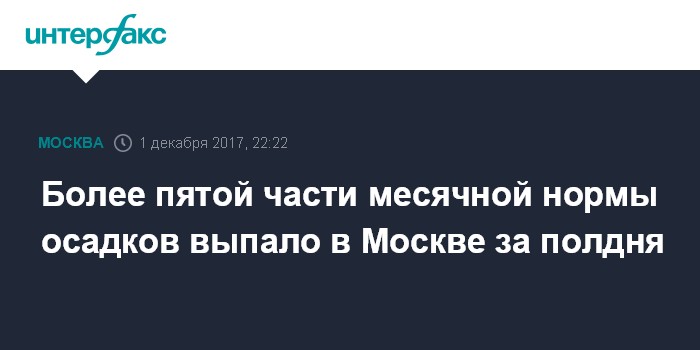 Москва. 1 декабря. INTERFAX.RU - В первый день зимы за половину суток на базовой московской метеостанции на ВДНХ зафиксировано выпадение 12 мм осадков в эквиваленте воды, сообщили "Интерфаксу" в столичном метеобюро.