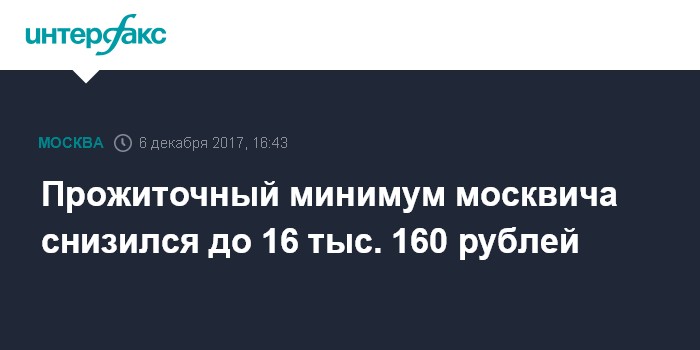 Москва. 6 декабря. INTERFAX.RU - Прожиточный минимум в Москве в расчете на душу населения в третьем квартале 2017 года снизился на 266 рублей и составил 16 тыс. 160 рублей, следует из постановления столичного правительства, подписанного мэром Сергеем Собяниным.