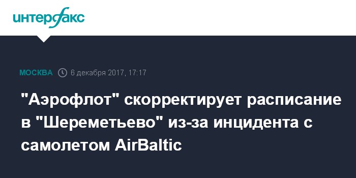 Москва. 6 декабря. INTERFAX.RU - "Аэрофлот" скорректирует расписание рейсов из "Шереметьево" в среду из-за инцидента с самолетом AirBaltic.