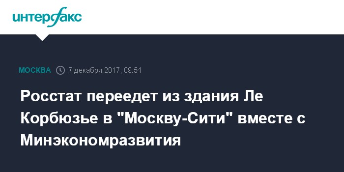 Москва. 7 декабря. INTERFAX.RU - Федеральная служба государственной статистики (Росстат), которая сейчас занимает историческое здание, построенное архитектором Ле Корбюзье, в центре столицы, переедет вместе с Минэкономразвития в комплекс "Москва-Сити".