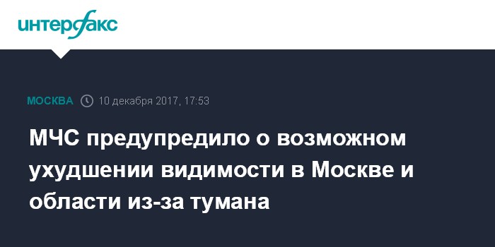 Москва. 10 декабря. INTERFAX.RU - Туман ожидается в ближайшие три часа в столичном регионе с ухудшением видимости местами до 200 м, сообщает в воскресенье Главное управление МЧС РФ по городу Москве.