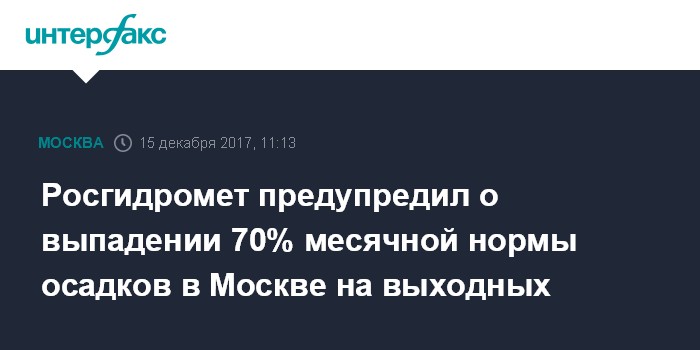 Москва. 15 декабря. INTERFAX.RU - По предварительным расчетам, прирост осадков в столице за пятницу, субботу, воскресенье и ночь на понедельник может составить до 38 мм - то есть 68% месячной нормы, которая в декабре насчитывает 56 мм, сообщает Росгидромет.