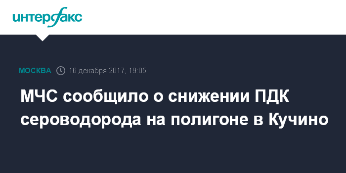 Москва. 16 декабря. INTERFAX.RU - МЧС сообщает о снижении предельно допустимой концентрации (ПДК) сероводорода в воздухе в районе полигона твердых бытовых отходов "Кучино" с 25-кратного до 1,2...10 кратного.
