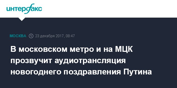 Москва. 23 декабря. INTERFAX.RU - Прямая аудиотрансляция поздравления президента РФ Владимира Путина прозвучит в московском метро и на МЦК в новогоднюю ночь, сообщили в субботу "Интерфаксу" в пресс-службе Департамента транспорта и развития дорожно-транспортной инфраструктуры Москвы.