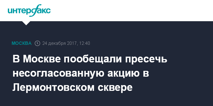 "Главное управление МВД России по городу Москве напоминает, что планируемое 24 декабря 2017 года публичное мероприятие в Лермонтовском сквере, не согласовано властями города Москвы в установленном законом порядке", - сообщили "Интерфаксу" в пресс-службе столичного главка полиции.