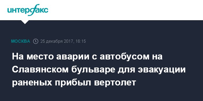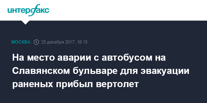 Москва. 25 декабря. INTERFAX.RU - На Славянском бульваре, где автобус съехал в подземный переход, приземлился вертолет Московского авиационного центра для эвакуации раненых, передает корреспондент "Интерфакса" с места событий.