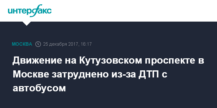 Москва. 25 декабря. INTERFAX.RU - Движение транспорта на Кутузовском проспекте на западе Москвы в обе стороны затруднено в связи с крупной аварией с участием автобуса подмосковного перевозчика "Мострансавто". Об этом сообщили "Интерфаксу" в пресс-службе ЦОДД московского правительства в понедельник.