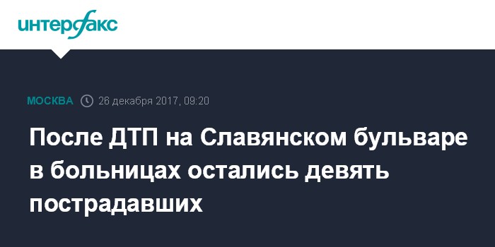 Москва. 26 декабря. INTERFAX.RU - По уточненным данным, в московских больницах к утру вторника остаются девять пострадавших в результате ДТП с участием автобуса на Славянском бульваре, сообщил "Интерфаксу" источник, знакомый с ситуацией.