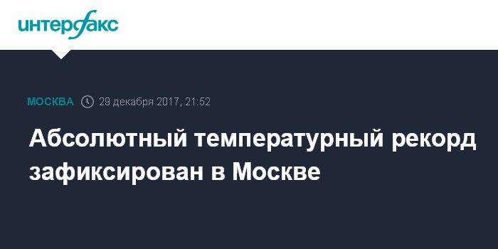 Москва. 29 декабря. INTERFAX.RU - По уточненным данным Гидрометцентра, в последний рабочий день 2017 года температура воздуха на базовой метеостанции на ВДНХ поднималась до 3,7 градусов, тем самым обновив абсолютный максимум за 138-летнюю историю метеонаблюдений в Москве.