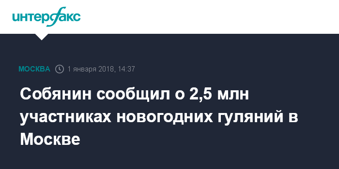 Москва. 1 января. INTERFAX.RU - В праздничных мероприятиях на улицах Москвы в ночь на 1 января приняли участие 2,5 млн человек, сообщил мэр столицы Сергей Собянин.