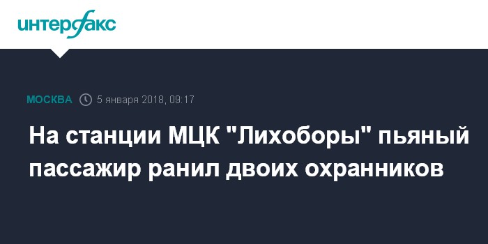 Москва. 5 января. INTERFAX.RU - Двое охранников Московского центрального кольца (МЦК) получили ранения из травматического пистолета в ходе конфликта с пьяным пассажиром вечером в минувший четверг.