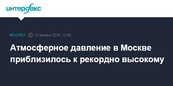 Москва. 13 января. INTERFAX.RU - Главная столичная метеостанция на ВДНХ в полдень субботы зафиксировала атмосферное давление на уровне 769 мм рт.ст., сообщили "Интерфаксу" в Гидрометцентре России.