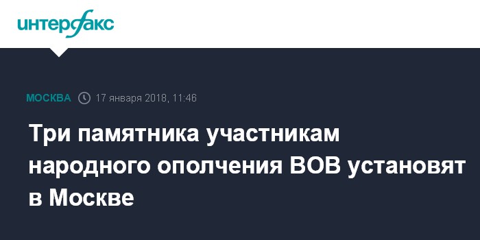 Москва. 17 января. INTERFAX.RU - Три памятника участникам народного ополчения в годы Великой Отечественной войны установят в Москве в этом году. Об этом сообщил руководитель столичного департамента строительства Андрей Бочкарев в среду.