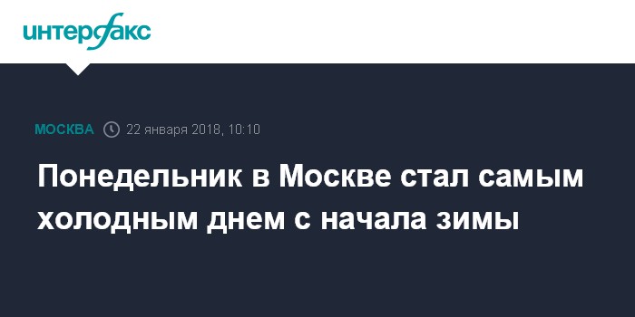Москва. 22 января. INTERFAX.RU - Утром в понедельник температура воздуха на базовой метеостанции на ВДНХ опускалась до минус 11,2 градуса, сообщили "Интерфаксу" в Гидрометцентре России.