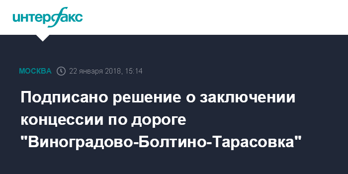 Москва. 22 января. INTERFAX.RU - Губернатор Московской области Андрей Воробьев подписал решение о заключении самого крупного концессионного соглашения по платной дороге "Виноградово-Болтино-Тарасовка" в Подмосковье, сообщает пресс-служба министерства инвестиций и инноваций региона.