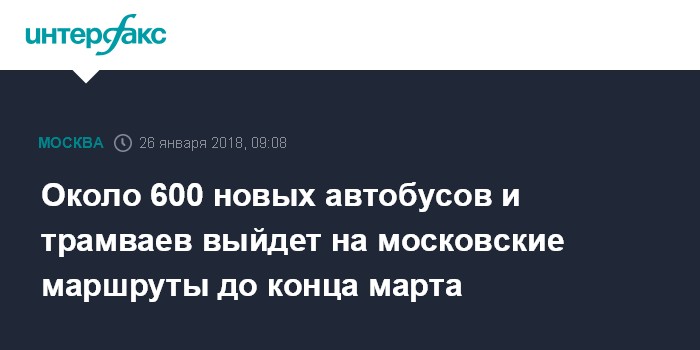 Москва. 26 января. INTERFAX.RU - До конца марта на маршруты наземного транспорта Москвы выйдут 588 автобусов и порядка 20 трамваев, в метро поступят новые поезда "Москва", сообщает сайт столичной мэрии в пятницу со ссылкой на заммэра города Максима Ликсутова.