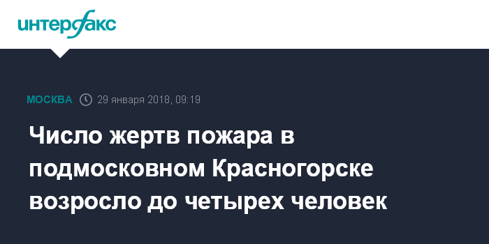 Москва. 29 января. INTERFAX.RU - Четверо приезжих из Таджикистана, в том числе двое детей, погибли при пожаре в арендуемой квартире в подмосковном городе Красногорске, сообщила представитель областного главка Следственного комитета Ольга Врадий.