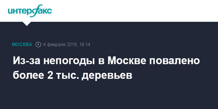 Москва. 4 февраля. INTERFAX.RU - Более 2 тыс. деревьев в Москве упали под тяжестью льда и снега, сообщил мэр столицы Сергей Собянин в твиттере в воскресенье.