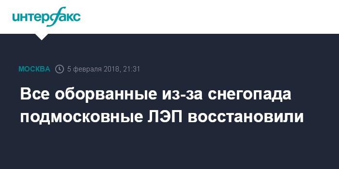 Москва. 5 февраля. INTERFAX.RU - В Подмосковье завершены работы по восстановлению линий электропередачи, говорится в сообщении, размещенном в понедельник на сайте регионального главка МЧС.