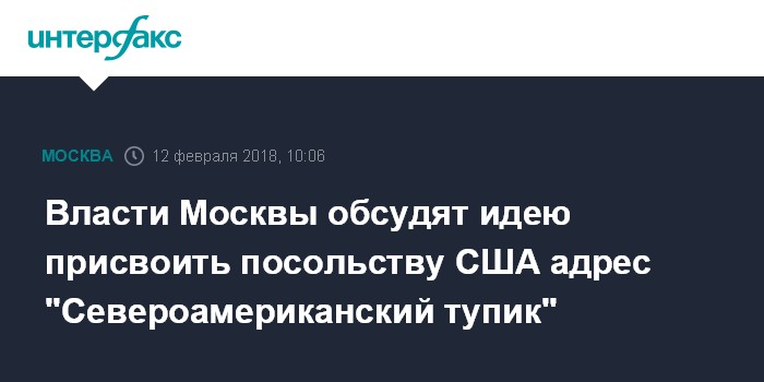 Ранее в январе сообщалось, что председатель комитета Государственной Думы по физической культуре, спорту, туризму и делам молодежи Дегтярев направил в мэрию Москвы письмо с предложением назвать безымянный внутридворовой проезд к Дому Наркомфина "Североамериканский тупик" в честь "навязчивой внешней политики США", и присвоить старому зданию посольства почтовый адрес: Североамериканский тупик, дом номер 1. Это предложение председатель комитета Госдумы высказал после переименования в Вашингтоне площади, на которой располагается посольство России.
