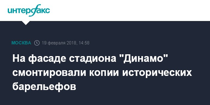 Москва. 19 февраля. INTERFAX.RU - Завершен монтаж копий исторических барельефов скульптора Сергея Меркурова на фасадах реконструируемого стадиона "Динамо" в Москве, сообщил журналистам в понедельник старший вице-президент банка ВТБ, руководитель проекта "ВТБ Арена Парк" Андрей Перегудов.