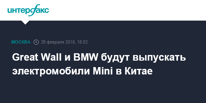 Москва. 26 февраля. INTERFAX.RU - Китайская Great Wall Motor и германская BMW подписали протокол о намерениях по совместному производству электромобилей Mini в Китае.