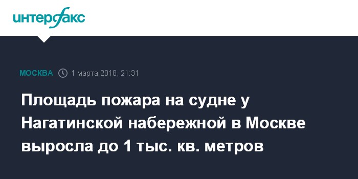 Москва. 1 марта. INTERFAX.RU - Площадь пожара на речном судне у Нагатинской набережной в Москве составляет уже около тысячи квадратных метров, сообщили "Интерфаксу" в пресс-службе столичного главка МЧС.