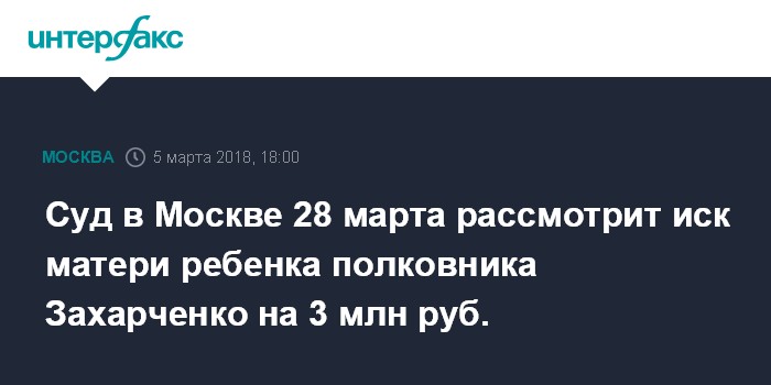 Суд в Москве 28 марта рассмотрит иск матери ребенка полковника Захарченко на 3 млн руб.