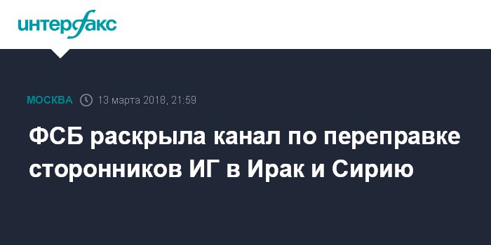 Москва. 13 марта. INTERFAX.RU - Федеральной службой безопасности РФ во взаимодействии с МВД на территории Москвы и Московской области пресечена противоправная деятельность этнической преступной группы, организовавшей канал нелегальной переправки сторонников "Исламского государства" (запрещена в РФ) в Сирию и Ирак для участия в боевых действиях сообщили в ЦОС ФСБ во вторник.