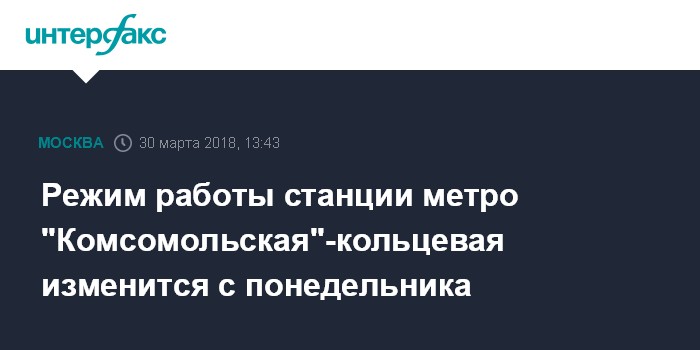 Москва. 30 марта. INTERFAX.RU - В связи с проведением капитального ремонта эскалатора со 2 апреля по 24 мая будет изменен режим работы вестибюля станции "Комсомольская" Кольцевой линии Московского метрополитена, сообщили "Интерфаксу" в пресс-службе подземки в пятницу.