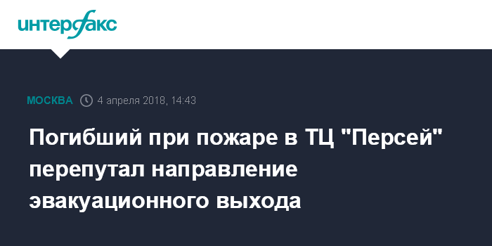 Москва. 4 апреля. INTERFAX.RU - Погибший при пожаре в ТЦ "Персей для детей" перепутал направление эвакуационного выхода. Об этом сообщил руководитель ГУ МЧС по Москве Илья Денисов.