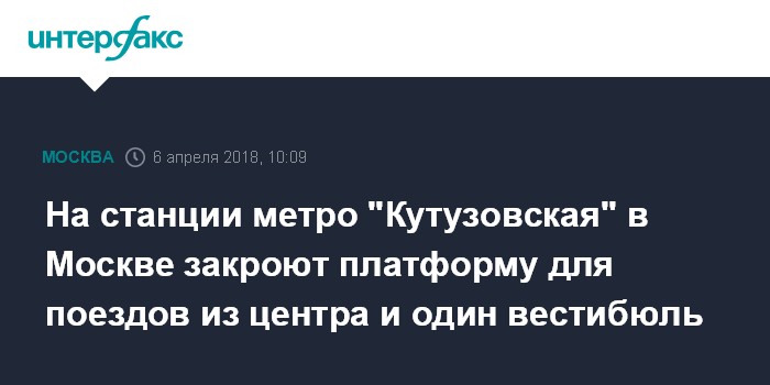 "В понедельник, 9 апреля, изменится режим работы станции "Кутузовская" Филёвской линии. Для ремонта закроют северный вестибюль и платформу по первому пути - поезда из центра не будут останавливаться для посадки и высадки пассажиров", - сообщили в пресс-службе "Интерфаксу".