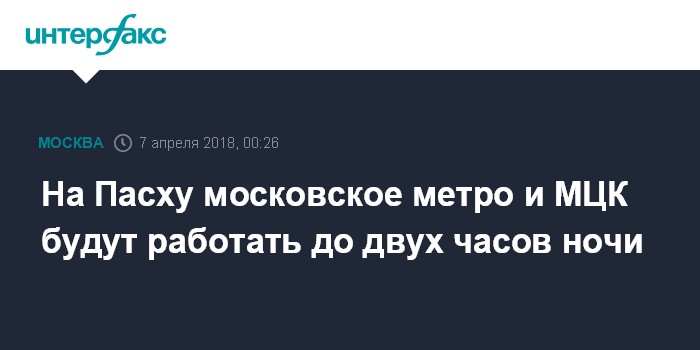 Москва. 7 апреля. INTERFAX.RU - Московский метрополитен в пасхальную ночь с 7 на 8 апреля будет работать на час дольше обычного - до 02:00, аналогично будет функционировать и Московское центральное кольцо (МЦК), наземный транспорт по наиболее популярным маршрутам будет работать до 03:30.