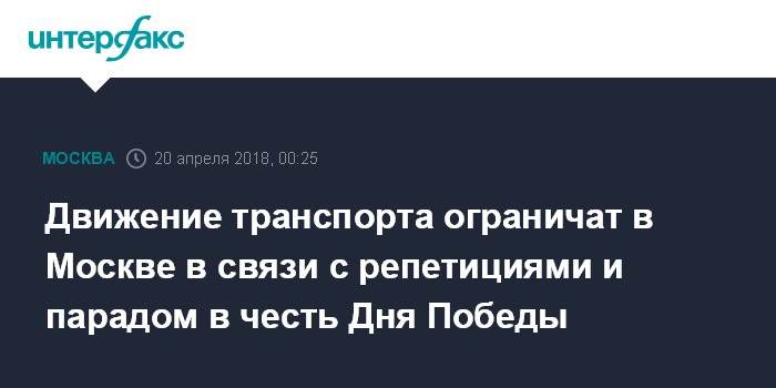Москва. 20 апреля. INTERFAX.RU - Движение транспорта в Москве будет ограничено с 20 апреля по 9 мая в связи с репетициями и военным парадом в честь 73-й годовщины Победы в Великой Отечественной войне, сообщает Центр организации дорожного движения (ЦОДД) правительства Москвы.