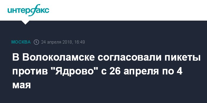 Москва. 24 апреля. INTERFAX.RU - Акции против мусорного полигона "Ядрово" пройдут в Волоколамске с 26 по 30 апреля, а также 2, 3 и 4 мая, они согласованы городской администрацией, сообщил глава городского поселения Петр Лазарев.