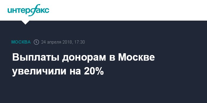 Москва. 24 апреля. INTERFAX.RU - Президиум московскомго правительства под руководством мэра Сергея Собянина во вторник решил повысить социальные выплаты донорам на 20%, передал корреспондент "Интерфакса".