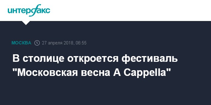 Москва. 27 апреля. INTERFAX.RU - Вокальные коллективы из 16 стран и 40 регионов Россия примут участие в фестивале "Московская весна А Сappella", который пройдет с 27 апреля по 9 мая, сообщил мэр столицы Сергей Собянин.