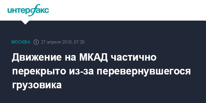 Москва. 27 апреля. INTERFAX.RU - От Можайского до Рублевского шоссе полностью перекрыто движение по внутренней стороне Московской кольцевой автодороги (МКАД) в связи с серьезной аварией - перевернулся груженый "КамАЗ", передает в пятницу корреспондент "Интерфакса".