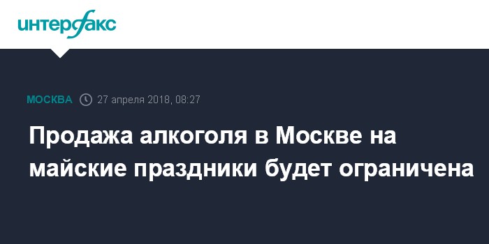 Москва. 27 апреля. INTERFAX.RU - Продажа спиртного в столице будет ограничена с 29 апреля по 2 мая, а также в День Победы, 9 мая, сообщил руководитель департамента региональной безопасности и противодействия коррупции Москвы Владимир Черников.