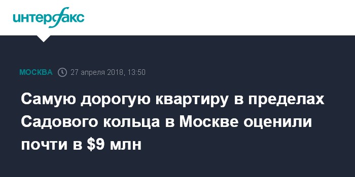 Москва. 27 апреля. INTERFAX.RU - Самая дорогая квартира в пределах Бульварного кольца Москвы в настоящее время стоит почти $9 млн, сообщили в компании Savills в России.