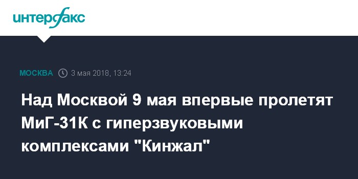 Москва. 3 мая. INTERFAX.RU - Модернизированные истребители МиГ-31К, оснащённые новейшим гиперзвуковым ракетным комплексом "Кинжал", примут участие в Параде Победы в Москве, сообщил в четверг министр обороны РФ генерал армии Сергей Шойгу.